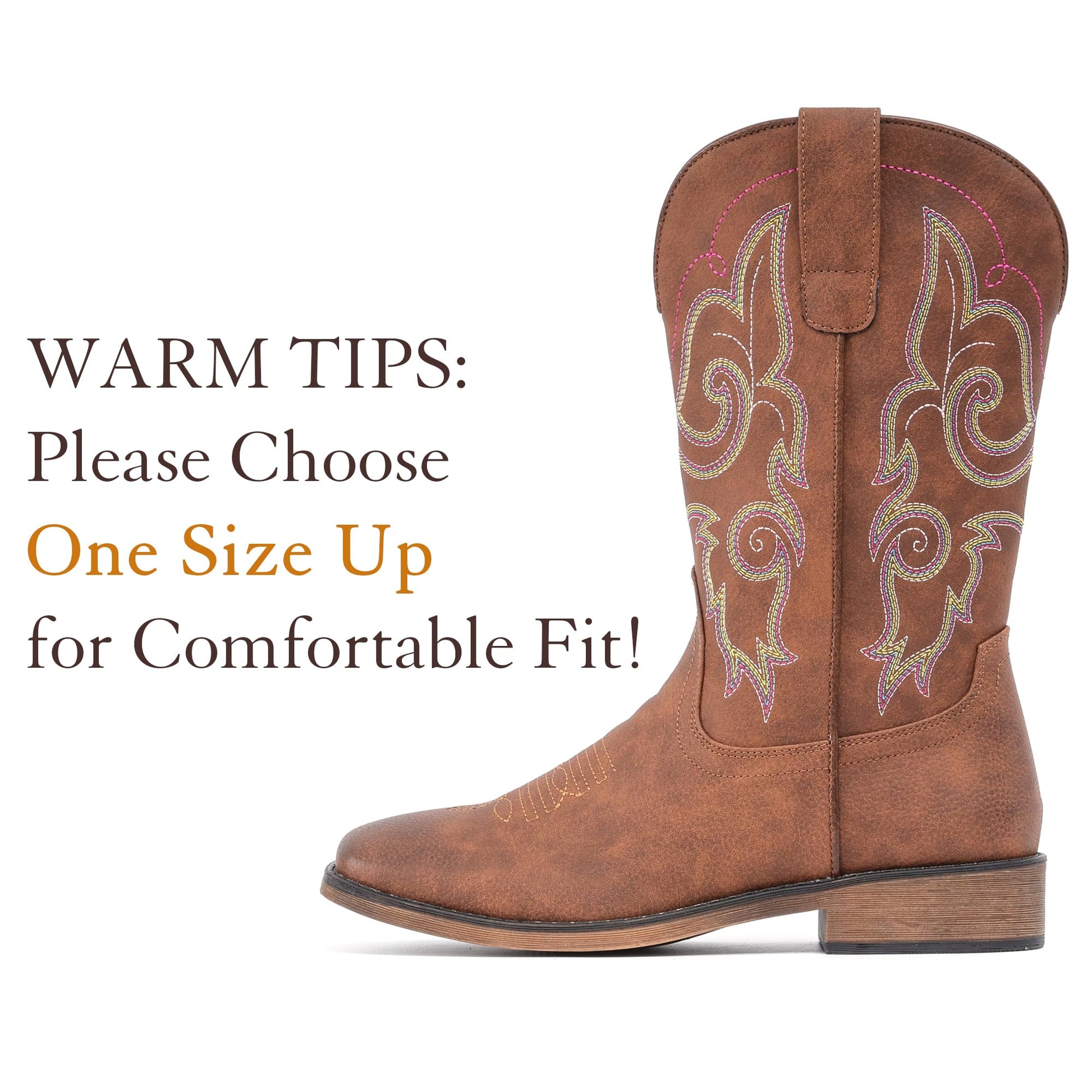 IUV Cowboy Boots For Women Square Toe Western Boots Mid Calf Cowgirl Boots Pull On Fashion Embroidered Cowboy Boots